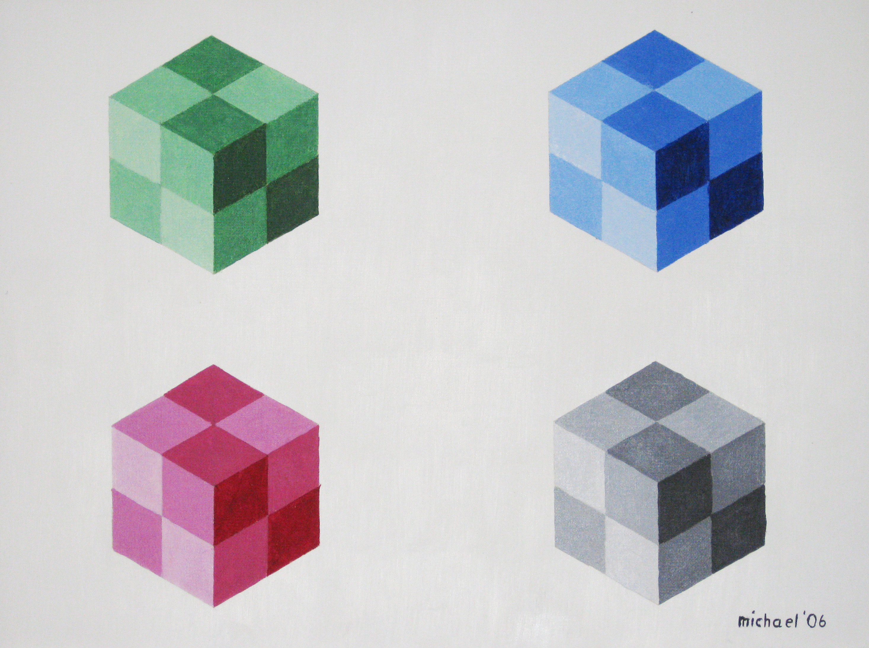 | Jetzt wird es geometrisch. Insgesamt wurden nur vier Farben vermalt, allerdings bewirken die helleren oder dunkleren Nachbarflächen, dass eine Farbe unterschiedlich wahrgenommen wird. Eine optische Täuschung. | |
