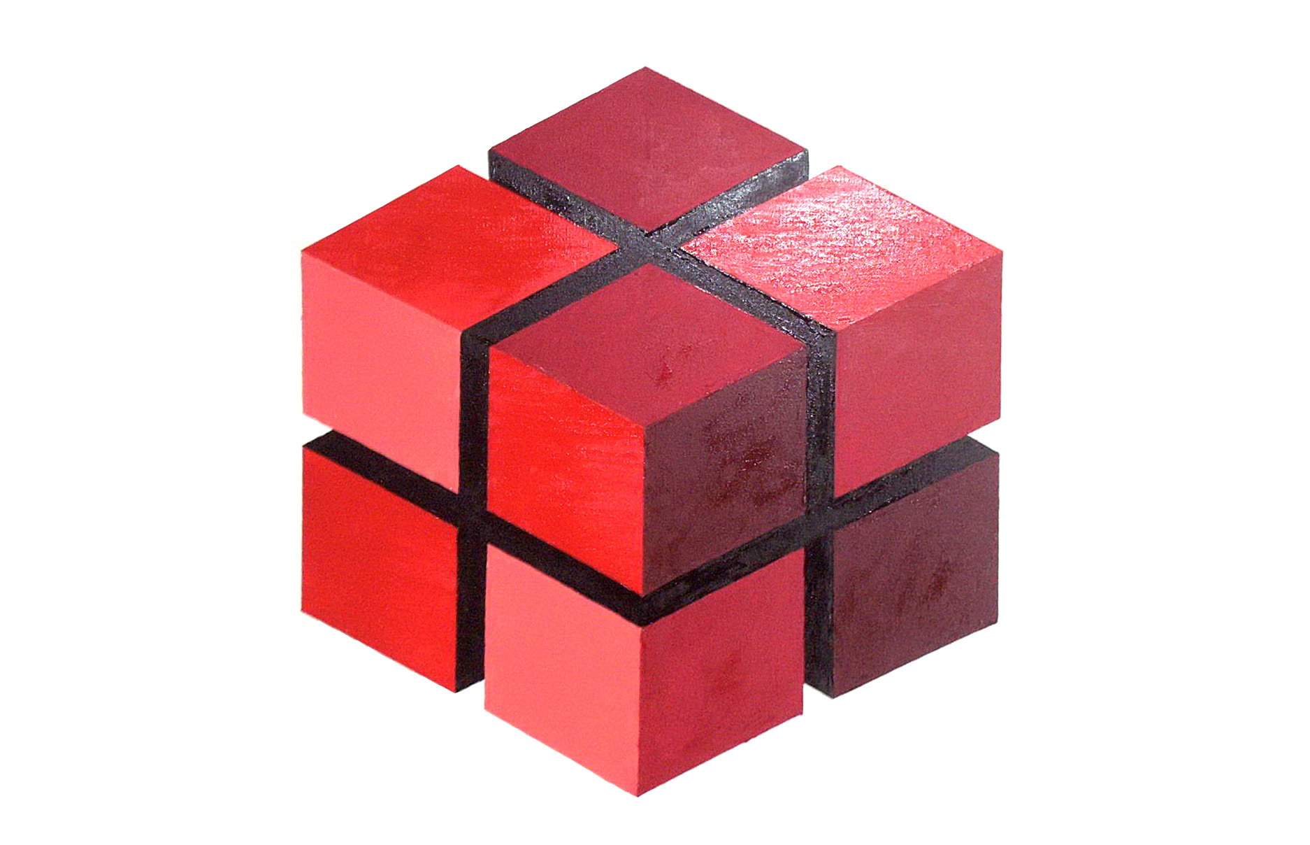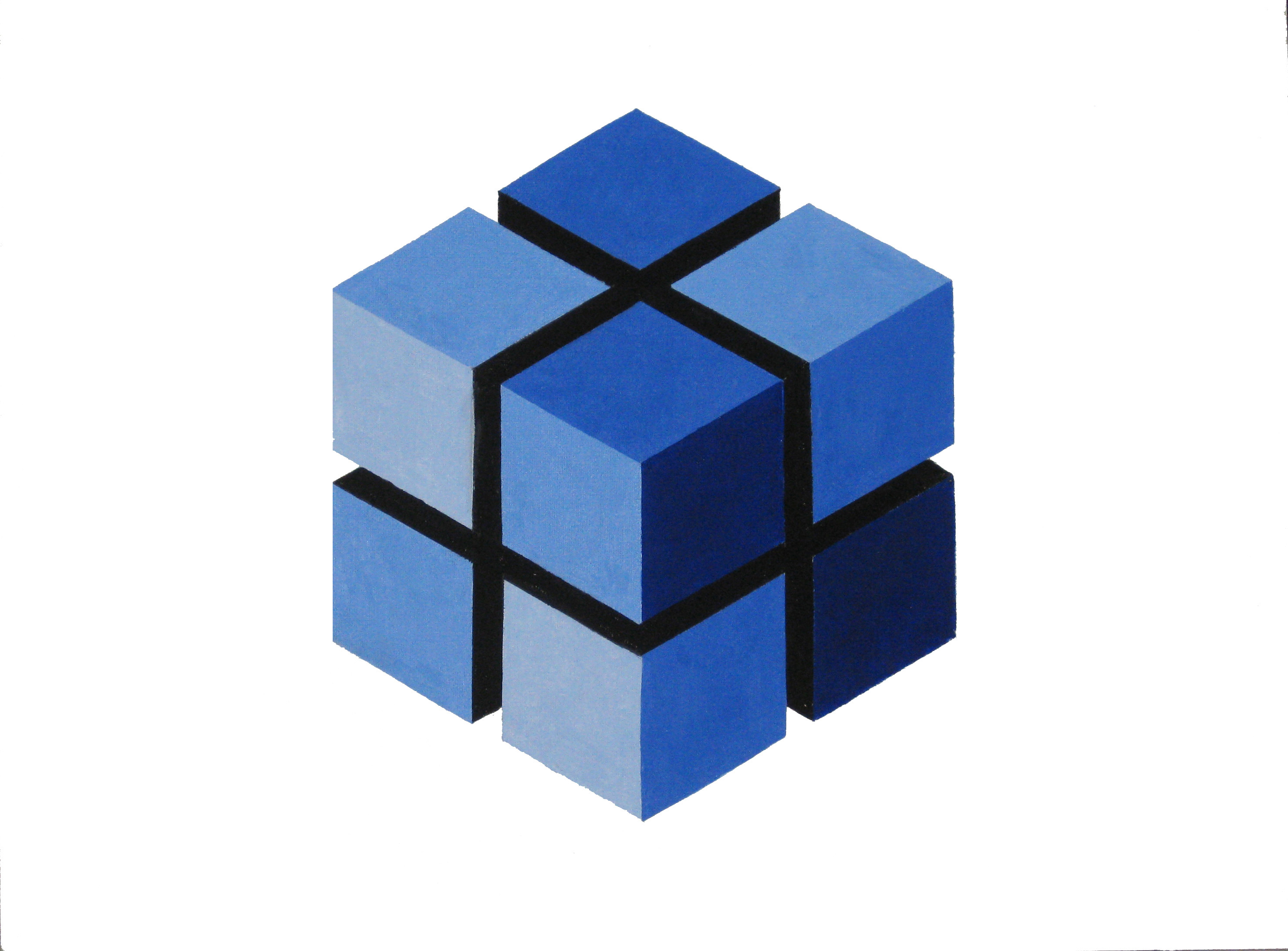 | Noch ein vierfarbiger Würfel, jetzt sind die einzelnen Stückchen etwas von einander entfernt. | |